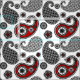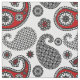 Ornate paisley pattern in black, white and shades of grey / grey, accented with deep red, on a white background