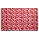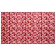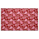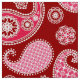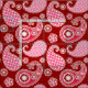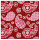 Fabric in an ornate paisley pattern in shades of light to deep strawberry pink, accented with white, on a dark red background