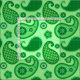 Decorator fabric in an ornate paisley pattern, in shades of emerald green and light to deep jade green, on a light jade green background background