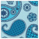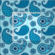 Fabric in an ornate paisley pattern in shades of light sky blue to deep cobalt blue on a soft ice blue background