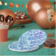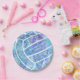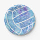 These cute volleyball themed paper party plates have a blue colour theme with purple and turquoise accents and feature the outline image of a simple volleyball - a doodle pattern of paislies, flowers and feathers in white covers all but one of the volleyball's textured-look panels - personalise with your message - by katz_d_zynes