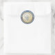The national seal of The Republic of Palau, is set on a pale blue background. The emblem is infused into a faux gold circle shape, and that, in turn, is nestled in the middle of a faux gold laurel wreath.