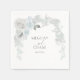 Elegant baby blue and white rose arch surrounded by pearly iridescent foliage enhances the bride and groom's names and wedding date on these paper napkins in a variety of sizes and styles. Choose cocktail, luncheon or dinner size and coined or non-coined style. This is part of a wedding stationery collection with matching wedding accessories. Design created for the BarefootBride™ © by WhimsicalArtwork™