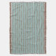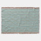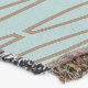 This throw blanket has a geometric design of sort of flat-ended ovals repeating across the design in brown on a field of pale blue.