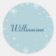 An elegant winter envelope seal/sticker. Easily customise this holiday envelope sticker with your family name in dark blue on a pale blue background with white snowflakes.