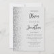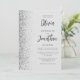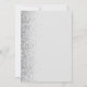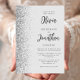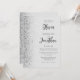 The left-hand edge of this elegant modern wedding invitation features a silver faux glitter border. The customisable text combines charcoal grey script and sans serif fonts on a pale grey background. The reverse side features a matching grey and silver design.