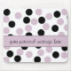 A pale pink and black polka dotted mouse pad with a customisable text area.