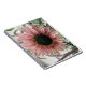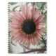 This awesome notebook features a beautiful photograph of a pale pink sunflower. The sunflower is naturally pink and the petals have a pale pink outer ring and a darker pink inner ring. The middle where the seeds are is black. This photograph was taken in a garden.