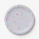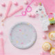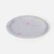 Paper plates with a design inspired by 80s geometric prints. The main background color is a pale greyish purple.