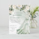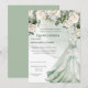 This elegant quinceañera invitation features a soft, romantic design with a delicate botanical theme. The top is adorned with lush ivory roses and muted greenery, accented by subtle gold speckles that add a touch of shimmer. A graceful watercolor-style ball gown in a soft sage green flows along the side, creating a refined and feminine focal point. The background has a gentle textured wash in pale green and ivory, providing a light, airy feel while keeping the center text area clean and easy to read. Classic serif typography in coordinating green tones enhances the timeless look, making this invitation perfect for a sophisticated and nature-inspired celebration.