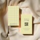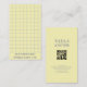 Business card design with a pale yellow chequered pattern and a minimal layout, featuring a QR code for quick access to a website or portfolio. Suitable for handmade clothing brands, creative businesses, or boutiques.