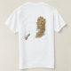 An editable title and slogan accompanies the red triangle with black, white and green bands to the right of the Palestinian flag on the front of this t-shirt. The back displays a detailed map of Palestine.