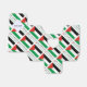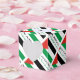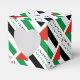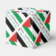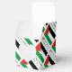 Personalised favour box shows the Palestinian Flag with three horizontal stripes of black, white and green with a red triangle on the left side. In this design, the flag features the word PALESTINE, underneath, in the colours of the flag. It is tiled for artistic effect. A white space of squiggly squares holds a place for a name to add a personalised touch.
