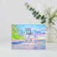 Beautiful watercolor of a palm beach, pink in the sky sunset. Full colour front with customisable text for a Save The Date postcard. Back is lighter with more customisable text.