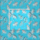 Cheerful palm leaf print fabric, featuring a pattern of white feathery fronds on a bright blue background.