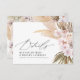 Pampas grass, palm leaf, foliage and orchid flower natural modern rustic wedding invitation details card. Beautiful elegant script text and natural, modern foliage grasses. Girly calm desert pink design. Ideal spring, summer, autumn, fall or winter wedding theme. Part of a modern wedding collection.