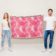 Throw blanket in a print of overlapping palm leaf silhouettes, in shades of deep coral pink and peach, against a pastel shell pink background