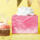 Wrapping paper in a print of overlapping palm leaf silhouettes, in shades of deep coral pink and peach, against a pastel shell pink background
