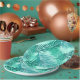 Paper plates in a tropical print of overlapping palm leaf silhouettes, in shades of turquoise / peacock and teal, against a light aqua background
