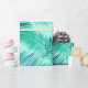 Wrapping paper in a print of overlapping palm leaf silhouettes, in shades of turquoise / peacock and teal, against a light aqua background