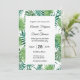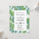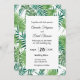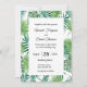 An elegant floral tropical greenery wedding invitation card. Templates for her name and your cermony information. An elegant white background, black letters. Watercolored green palm tree leaves and foliage as a frame.