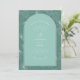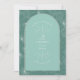 Arch design with line art and seashell illustrations and palm leaf background. Aqua colour scheme.