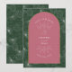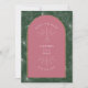 Arch design with line art and seashell illustrations and palm leaf background. Pink and green colour scheme.
