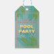 Pool Party Gift Tag featuring a illustrated swimming pool water and palm fronds in a mid-century modern style. Designs include elements of blues, and pinks, palm leave fronds, swimming pool and retro design. Includes template for personal customisation.