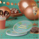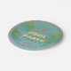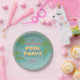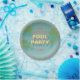 Pool Party Plate featuring a illustrated swimming pool water and palm fronds in a mid-century modern style. Designs include elements of blues, and pinks, palm leave fronds, swimming pool and retro design. Includes template for personal customisation.