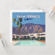 Display a cool, mid-century modern hotel, complete with pool and palm trees in Palm Springs in front of the San Jacinto Mountains of California.
