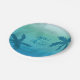 Paper plates for a tropical wedding featuring some blue palm tree silhouettes on an aqua blue background colour that is portraying a tropical ocean. In the middle there are customisable text fields for the names of the couple and for the date of the wedding.