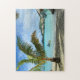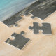Jigsaw puzzle of a palm tree on sand beach of a luxury overwater thatched roof honeymoon resort on the tropical island Bora Bora, near Tahiti in the pacific archipelago French Polynesia.