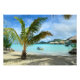 Photo print of a palm tree on sand beach of a luxury overwater thatched roof honeymoon resort on the tropical island Bora Bora, near Tahiti in the pacific archipelago French Polynesia. Great decoration on your wall!
