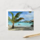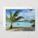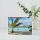 Postcard of a palm tree on sand beach of a luxury overwater thatched roof honeymoon resort on the tropical island Bora Bora, near Tahiti in the pacific archipelago French Polynesia.