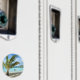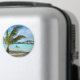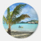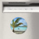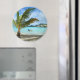 Round souvenir photo magnet of a palm tree on sand beach of a luxury overwater thatched roof honeymoon resort on the tropical island Bora Bora, near Tahiti in the pacific archipelago French Polynesia.