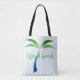 Stylish tropical feel all over print tote bag done in a light blue and white vertical stripe pattern, with graphics of a big blue and green palm tree. Green text reads Life's a beach and can be personalised to read what you want.