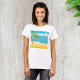 A scenic view of a palm tree beach with a bright sun. This design looks really effective on this Womens T-Shirt