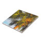 In a tropical mood, the original photograph by MaeFlowers on this small Ceramic Tile shows the top of a palm tree with its branches and trunk bathed in the warm glow of the afternoon sun. The long, pointed branches in the background are dark green, spreading out like fans. The branches in the foreground are a light yellow green, curving outward as they catch the sunlight. The tree trunk, normally a medium brown colour, looks almost orange in the late afternoon light. A pale aqua blue sky background sets off the rich earth tones of the palm tree, and completes the tropical scene.