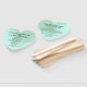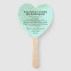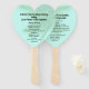 Tropical palm fronds wedding program in the shape of a heart. Create a fan program for an outdoor ceremony to keep the heat and bugs away. This program is light aqua blue with a background of long palm leaves. Customise black text on both sides for a simple and casual event.