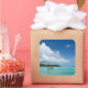 Square photo sticker of a small island with a palm tree in the turquoise lagoon of the tropical island Bora Bora near Tahiti in French Polynesia.
