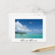 Postcard of a small island with a palm tree in the turquoise lagoon of the tropical island Bora Bora near Tahiti in French Polynesia with a white border and the text: 'Bora Bora'.