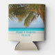 Tropical wedding custom drink coozie for a beer can, with big palm tree image at the sea. Beautiful turquoise water and nearly white beach sand is the backdrop for two lines of text.