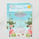 Pink flamingos with palm tree, cocktails on the beach. This invitation is easily customised for your event by simply adding your details.