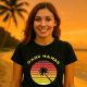 Silhouette of a tropical palm tree against a retro style sunset. You can customise the colours and personalise the "Oahu Hawaii" text with this template.