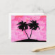 Postcard in a black silhouette of palm trees on a tropical island, against a soft dawn pink and coral background with back-lit clouds