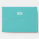 Palm tree & starfish tropical beach destination wedding envelope with monogram, featuring a tropical scenery: a palm tree with coconut on a sandy beach with starfish, blue sea/ocean water and the sky with the sun and clouds on the inside. Great for a summer, tropical, beach wedding. Blue, green, yellow, brown.