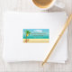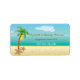 Palm tree & starfish tropical beach destination wedding label, featuring a tropical scenery: a palm tree with coconut on a sandy beach with starfish, blue sea/ocean water and the sky with the sun and clouds. Great for a summer, tropical, beach wedding. Blue, green, yellow, brown.