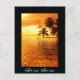 Postcard with a horizontal palm tree hanging over the water of the pacific ocean during sunset on a tropical island with a black border and the text: 'Bora Bora'.