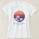 Customise this cute beachy tee with your town or city name in handwritten script, with the state beneath in modern sans serif. Design features a vintage style gradient sunset with palm tree silhouettes overlaid.
