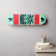 Custom skateboard featuring a dramatic palm tree and tropical island silhouette against vintage dark green, light green, and red stripes. Turtle silhouettes grace the top and bottom of this beach theme skateboard. Your or your recipient's initial monogram appears in green against the palm tree. Make sure to type your initial to replace the placeholder sample in the Peronalize section.